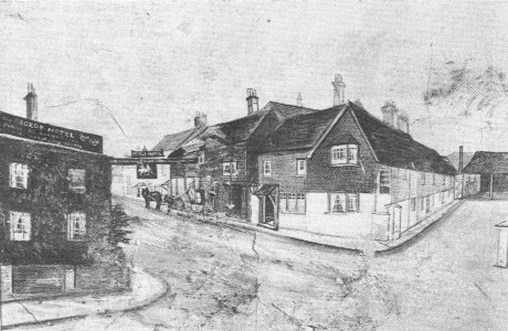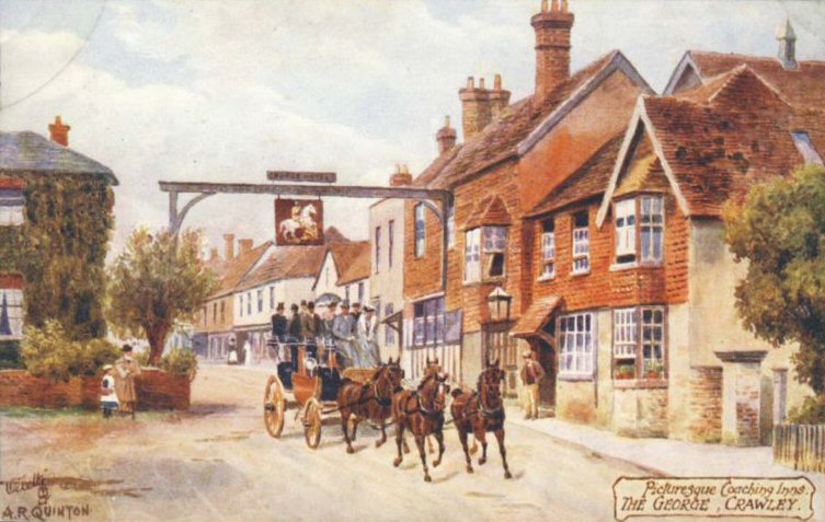 The George, probably originally a farmhouse, originated in the fifteenth century when a horse track was built between Reigate and Crawley. In 1580 it was included in the will of Richard Covert. In 1755 the road was widened and turnpiked and it became a busy coaching inn. The entrance on the northern end of the George led to a yard and stables at the rear. An extension was built over the entrance in about 1902. The annexe, in the middle of the High Street, was built in about 1800 and demolished in 1933, and in 1934 the hotel took over the premises of Holden's, the plumbers, next door.