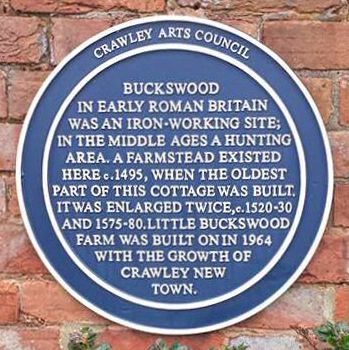 Buckswood in early Roman Britain was an iron-working site; in the middle ages a hunting area. A farmstead existed here c. 1495, when the oldest part of this cottage was built. It was enlarged twice, c. 1520-30 and 1575-80. Little Buckswood farm was built on in 1964 with the growth of Crawley New Town. Roger Bastable (1950-2007) 34 High Street