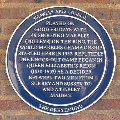 Played on Good Fridays with 49 shooting Marbles (tolleys) on the ring, the World Marbles Championship started here in 1932. Reputedly the knock-out game began in Queen Elizabeth's reign (1558-1603) as a decider between two men from Surrey and Sussex to wed a Tinsley Maiden. (The Greyhound) Crabbet Arabian Stud