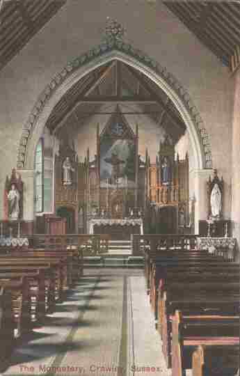 In the mid-nineteenth century the Roman Catholic congregation held their services in the coach house of Mrs. Montgomery's home, The Elms (later known as Buckswood Grange), in Horsham Road. In 1859 Mrs. Montgomery invited a group of Franciscan Friars to establish a church. The first Superior was Father Anthony of Monte Lupone, who lived with his companions in a cottage in the grounds of The Elms.