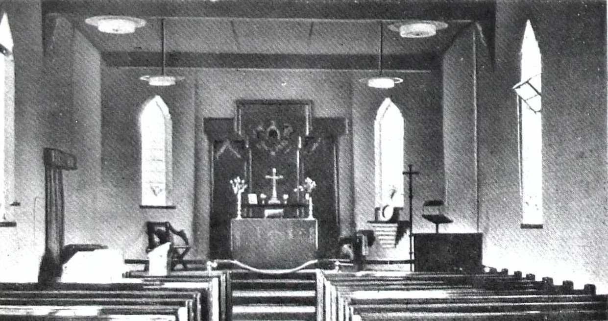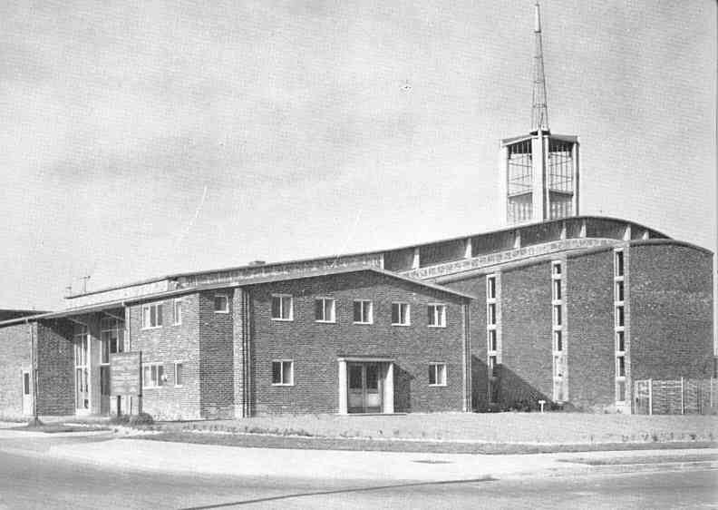 The church met in a temporary building for four years before the current church, designed by TF Ford, opened in 1962.