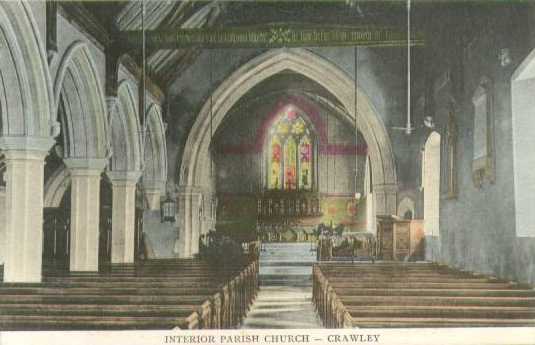 St. Peter's was built in 1893, replacing a mission chapel built in 1880. It became the parish church of West Crawley in 1901. The original West Green church was in Alpha Road, which was used as St Peter's Church Hall until it was demolished about 1975. During the 1930s the Rev. Sidebotham lived in what was known as the the Old Vicarage in Springfield Road, but by 1939 the vicar lived in West Green Drive.